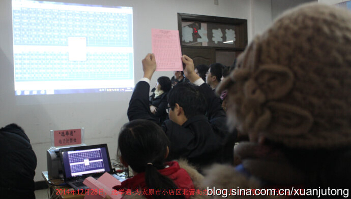 (2014年12月28日,选举通-为太原市小店区北营街办许西社区选举提供电子快速计票。)